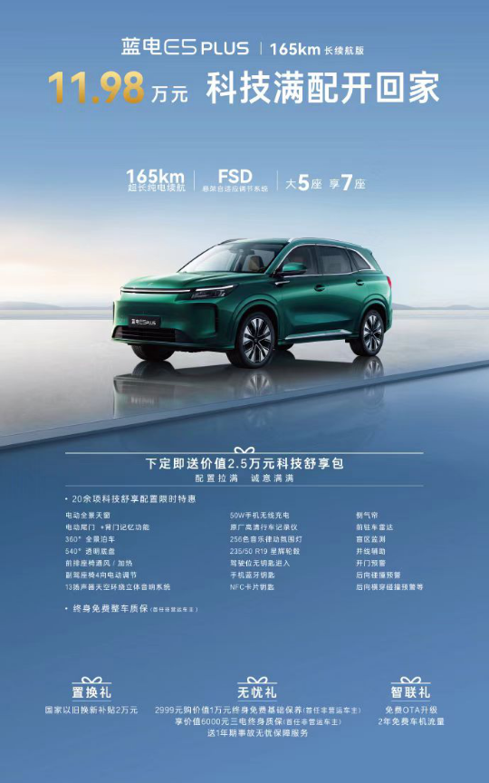 为了进一步降低用户的“拥车成本”,蓝电E5 PLUS在12月还推出了丰富的购车优惠政策。其中针对11.98万元的165km长续航版,下定即送价值2.5万元的“科技舒享包”;这里面除了包含有电动全景天窗、电动/记忆尾门、360°全景泊车、540°透明底盘、前排座椅通风/加热、13扬声器天空环绕立体音响系统、50W手机无线充电、256色音乐律动氛围灯等20余项配置外,还有提供了终身免费整车质保服务(非首任营运车主)。也就说,只需要11.98万元,就能将这辆炙手可热、科技满配的“年度黑马”开回家。