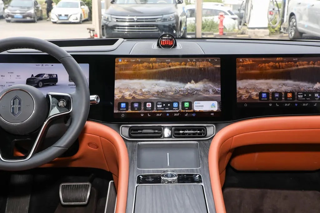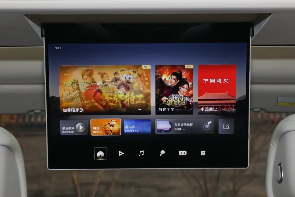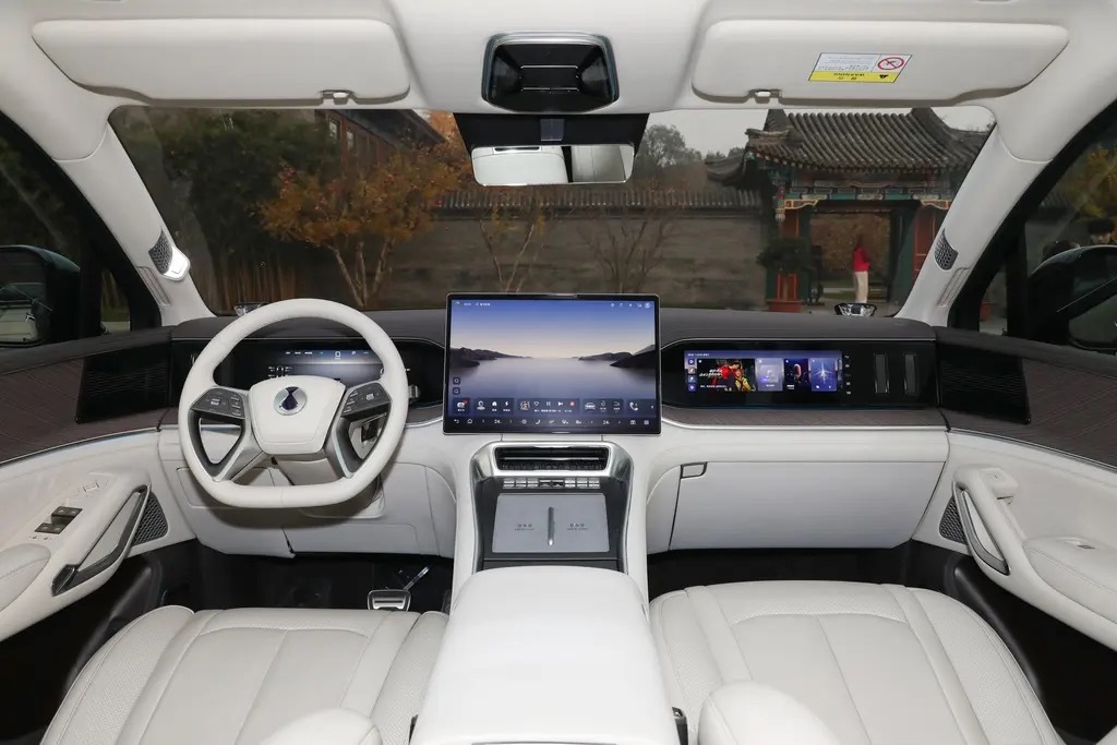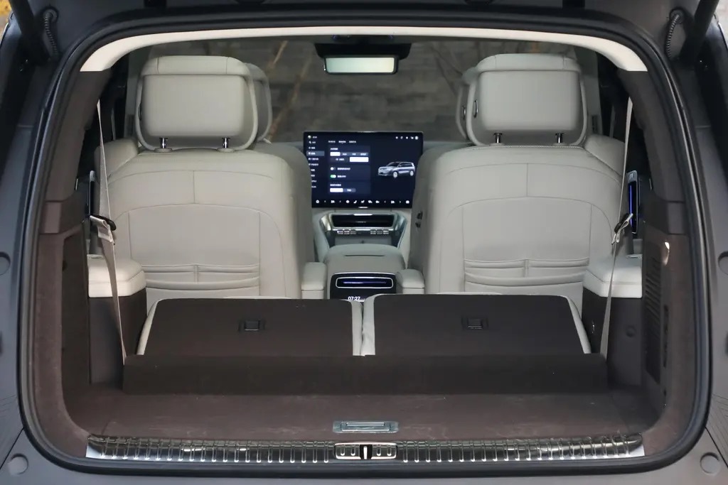 中控台的平直线条设计某种程度上算是和外观的相互呼应,视觉效果还是很大气的。车内的屏幕组合很吸引眼球,13.2英寸的主副驾驶娱乐信息屏、17.3英寸的中控屏和50英寸的AR-HUD,以及第二排顶部的17.3寸后排吸顶屏,整个车内几乎被堆砌成了一个私人影院。此外,车内的11.5L双层冰箱、双桌板、四个50W无线快充等配置,对于家庭用户来说是真的方便。而且,在第三排座椅立起来的时候,N9的后备厢依旧有很大的储物空间,足以应对一般家庭出门会带的东西,无论是行李、户外装备还是运动装备都能轻松收纳。