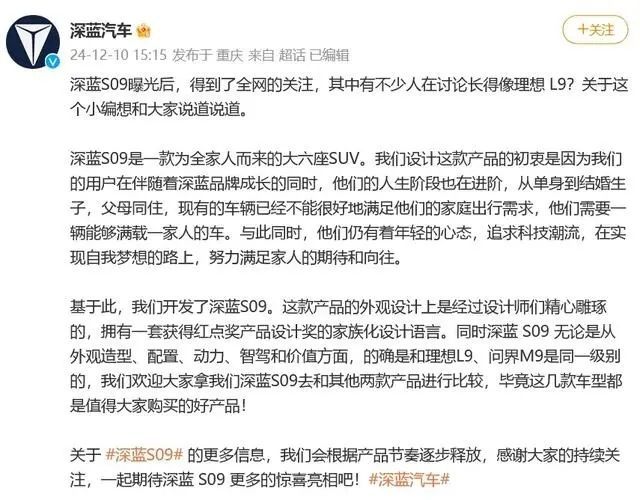 深蓝汽车官方回应:“这款产品的外观设计上是经过设计师们精心雕琢的,拥有一套获得红点奖产品设计奖的家族化设计语言。同时深蓝S09无论是从外观造型、配置、动力、智驾和价值方面,的确是和理想L9、问界M9是同一级别的,我们欢迎大家拿我们深蓝S09去和其他两款产品进行比较,毕竟这几款车型都是值得大家购买的好产品!”