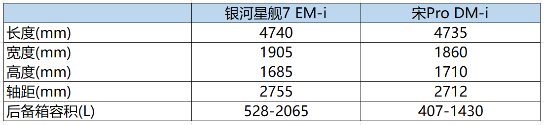 车身尺寸方面,星舰7 EM-i长宽高分别为4740mm/1905mm/1685mm,轴距为2755mm,除了车身高度之外,其它维度相比宋Pro DM-i都稍有优势。另外,星舰7 EM-i的后备箱空间达到了528L,在放倒后排座椅之后可以拓展到2065L,所以在空间方面星舰7 EM-i是有着较大优势的。