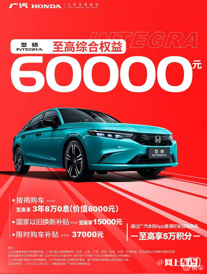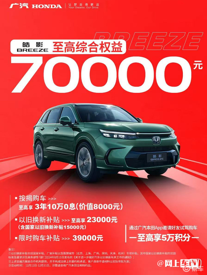 广汽本田官方表示,12月12日-12月31日期间,购买雅阁、皓影、型格、冠道、奥德赛可享受限时综合优惠,冠道、奥德赛力度最大,至高综合权益达到了8万元。最便宜的是型格,指导价12.99万元起,享受优惠后起售价仅为6.99万元。