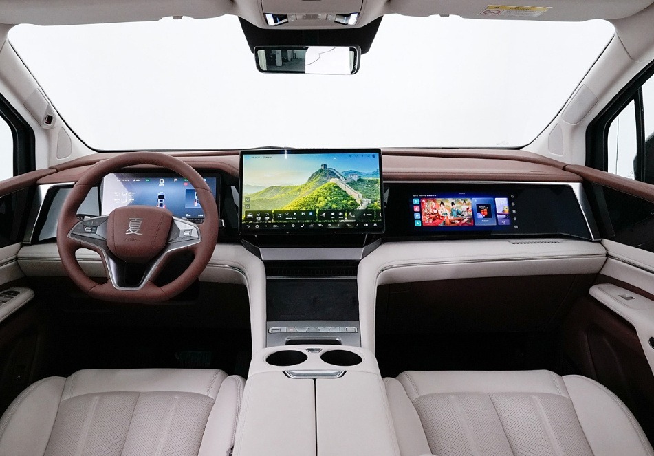 比亚迪夏的内饰设计颇具创意,采用了王朝家族的最新内饰设计语言。该设计主要强调稳重与大方。车内中控台从左到右依次配备了仪表盘、悬浮式中控显示屏和副驾驶娱乐屏,同时后排车顶还特别设置了中央吸顶屏。除仪表盘外,其他三块屏幕可以实现影音联动,并支持外接AR眼镜等设备。作为顶级配置版本,该车搭载了DiLink 150智能座舱系统,支持5G网络、OTA升级、车联网和应用商店等功能,实现了“所见即可说”,配置一应俱全。