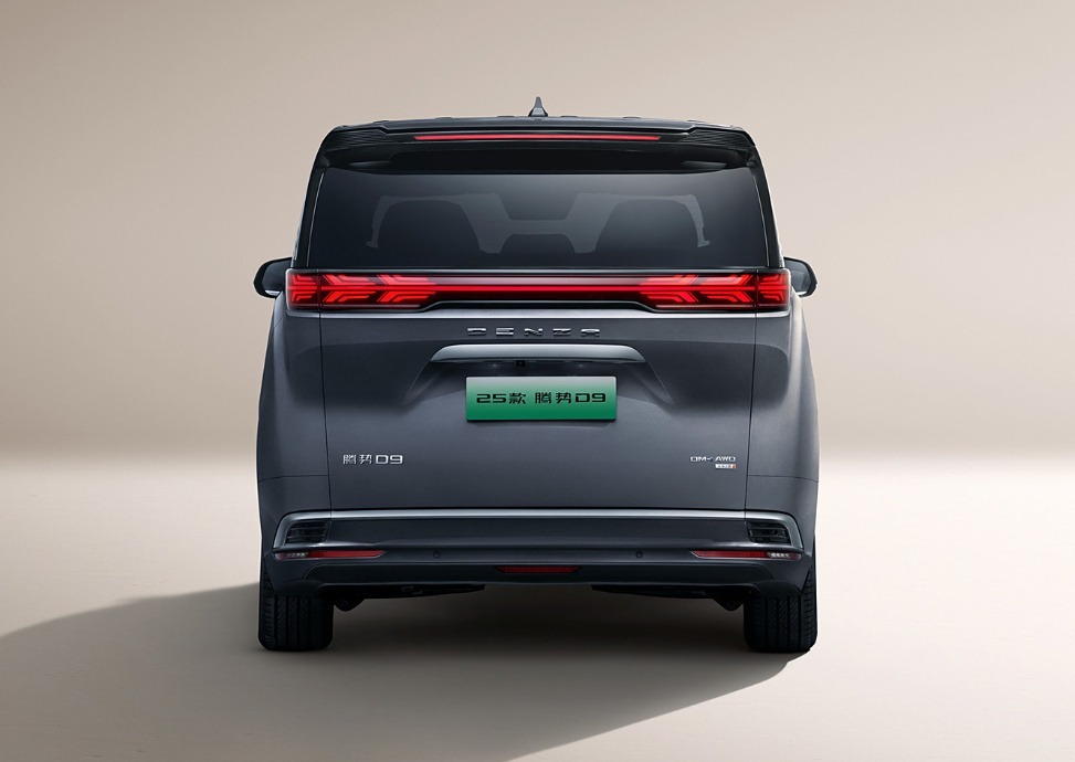 腾势D9 DM-i的车尾设计保持了一贯的简洁风格,其贯穿式尾灯组合在当下依然展现出极高的审美价值。与大尺寸扰流板及银色横向装饰条等元素相得益彰,共同营造出一种稳重而均衡的视觉效果。