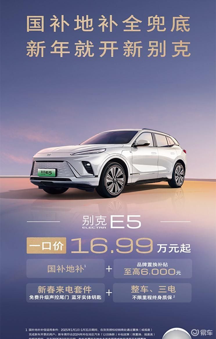 值得一提的是,别克还推出了全新的购车置换补贴政策。在2025年1月1日至1月31日期间购买别克E5的消费者,不仅可以享受到这一政策带来的实惠,还可叠加至高6000元的品牌置换补贴以及整车不限里程终身质保等超值礼遇。这些优惠政策无疑将进一步刺激消费者的购买意愿,推动别克E5在市场上的销量增长。