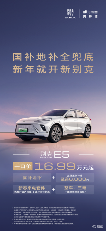 除了“新春来电套件”,在2025年1月1日-1月31日期间购买别克E5,还可享受别克品牌全新推出的购车置换补贴兜底安心大礼,以及至高6000元的品牌置换补贴和整车不限里程终身质保。多重福利叠加,让您以更实惠的价格,轻松开启智电出行新生活。