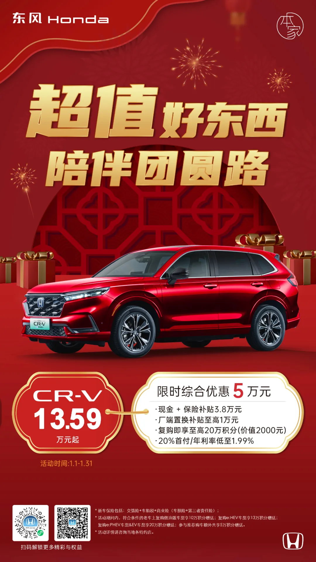 时值年关购车旺季,作为陪伴超300万用户的全能家用SUV,东风本田CR-V推出20%首付/年利率低至1.99%的金融计划,限时综合优惠5万元——包括现金+保险补贴3.8万元,厂端置换补贴至高1万元,复购即享至高20万积分(价值2000元),购买CR-V仅需13.59万元起。