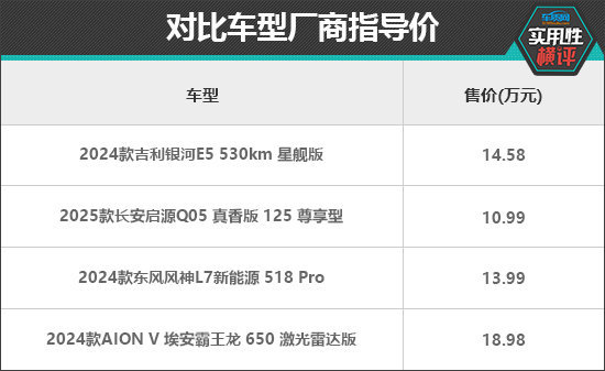 本期参与对比的四款新能源紧凑型SUV在实用性方面均交出了令人满意的答卷,满足日常基本使用需求完全没有问题,并且还提供了丰富的舒适性和实用性配置。不过,从具体测试环节来看,四款车型也都存在值得优化的地方。比如吉利银河E5左右外后视镜视野范围较小;长安启源Q05主驾驶座椅前后移动距离较短;东风风神L7新能源原地掉头的最小路面宽度数值偏大;埃安第二代AION V后备厢容积略小等。综合来看,四款车型的实用性表现均未有明显硬伤,消费者可以按需进行选择。