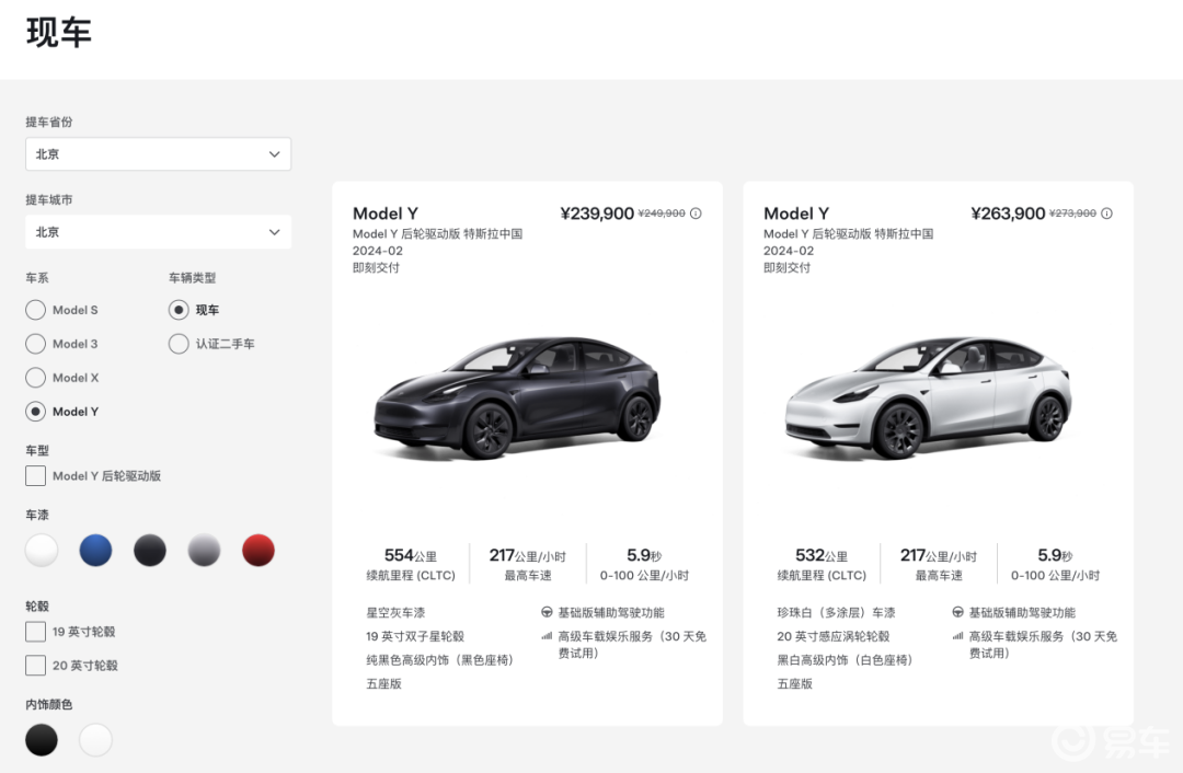 此外,旧款的Model Y的介绍页面已经在官网全面下架,但现车页面里还有少量现车可供选择,且依旧能够享受此前“5年0息”+10,000元尾款减免的政策。