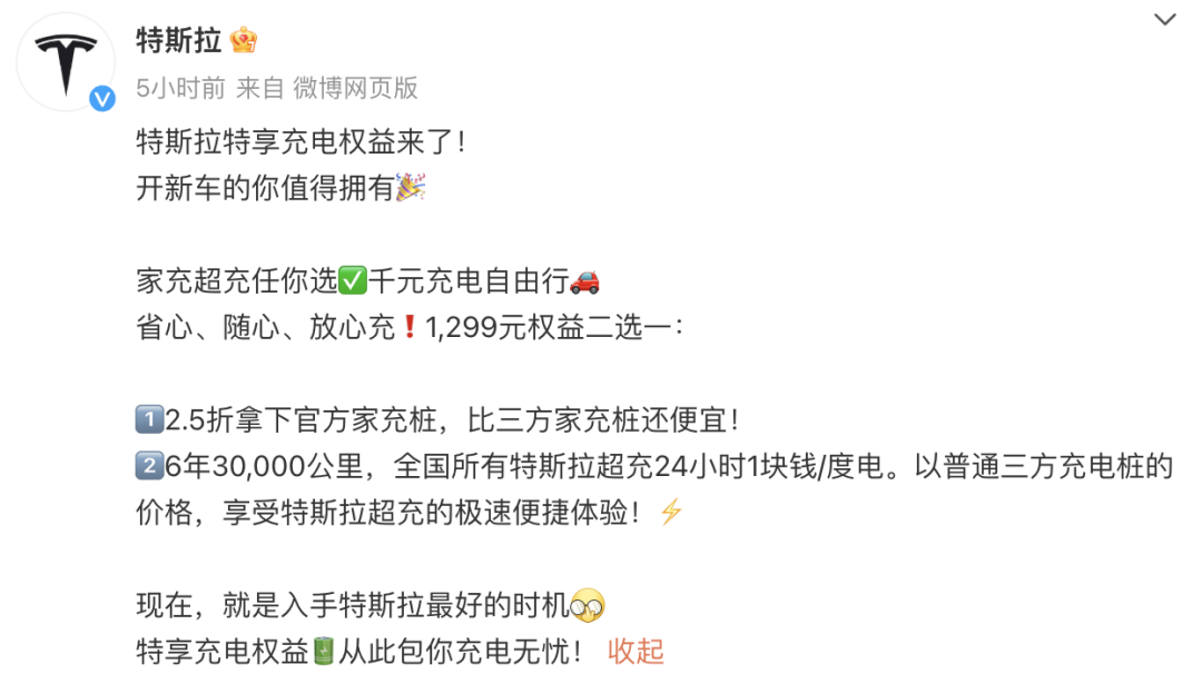 就在发稿前,特斯拉还公布了最新的“特享充电权益”:订购Model 3或Model Y的指定版本车型,1,299元可享Cybervault充电桩及40米国标安装服务或6年3万公里,全国所有特斯拉超充站24小时每度电一元的权益二选一。