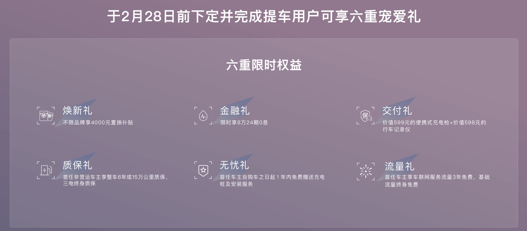 当下购车,福利满满!限时六重宠爱礼诚意十足,不限品牌可享 4000 元置换补贴,轻松开启换车之旅;限时提供 8 万 24 期 0 息金融方案,减轻购车资金压力;赠送价值 599 元的便携式充电枪和价值 598 元的行车记录仪;首任非营运车主可享受整车 6 年或 15 万公里质保、三电终身质保;购车之日起 1 年内,首任车主还能免费获得充电桩及安装服务;车联网服务流量 3 年免费,基础流量终身免费。