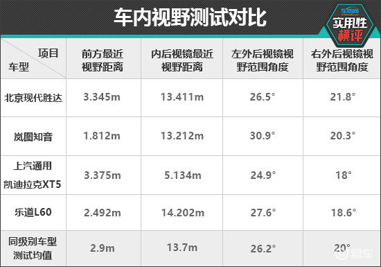 在安全测试环节,我们针对车辆日常使用过程中最常用到的视野范围进行了测量和比对。测试过程中,车内所有座椅均已调整至最低状态,所测出的数据与驾驶者正常使用时均有一些偏差,仅供参考。