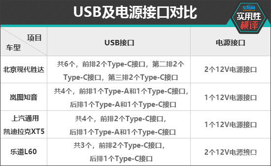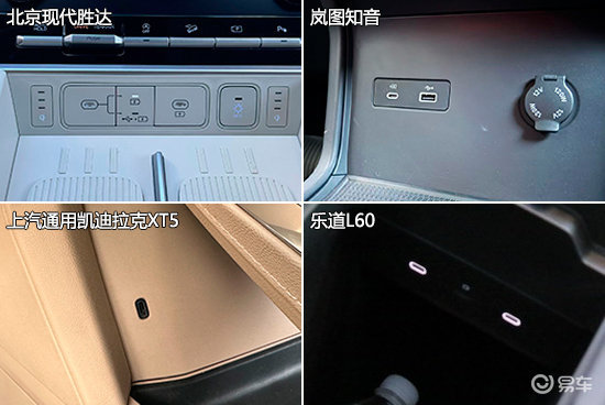 充电接口方面,北京现代胜达在数量上要优于另外三款车型,全车共配备了6个USB接口,但类型单一。岚图知音虽然接口数量不及北京现代胜达,但前后排均提供两种类型接口,能够更好满足乘客的日常充电需求。北京现代胜达和乐道L60配备2个12V电源接口,可以满足日常生活所需。