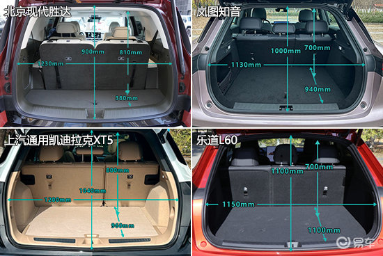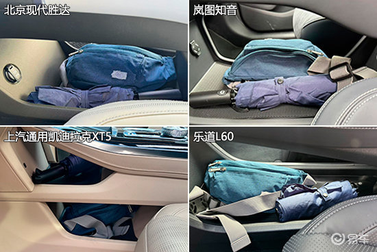 后备厢方面,四款车型的后备厢地台都比较平整;两款纯电车型岚图知音和乐道L60在掀开地台后,底部还设有私密性的储物空间。上汽通用凯迪拉克XT5在后备厢两侧设置了储物格,可放置一些小件物品。对于四款车型的后备厢实际载物能力,我们进行了测量,上汽通用凯迪拉克XT5的四项数据均超过同级别车型测试均值,整体表现好于其他三款车型。
