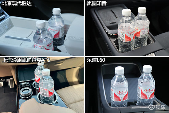 杯架测试中,北京现代胜达在数量方面表现相对出色,共配备10个水杯架,但第二排和第三排杯架未配备限位器。其他三款车型全车均提供4个水杯架,上汽通用凯迪拉克XT5和乐道L60全部杯架都有限位器。