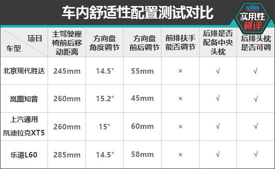 主驾驶座椅前后移动距离方面,乐道L60表现最为出众,测试数值达到285mm;北京现代胜达在这一环节排名垫底,仅为245mm,这与其采用三排座椅布局有一定关系。方向盘调节方面,岚图知音上下调节角度最为出色,整体表现好于其他三款车型;前后调节距离表现最佳的是上汽通用凯迪拉克XT5,达到60mm。
