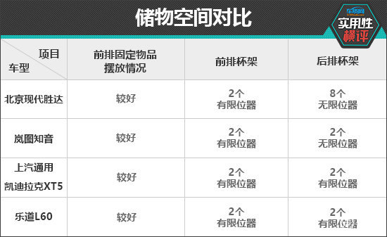 本期参与对比的四款中型SUV在实用性方面均交出了令人满意的答卷,满足日常基本使用需求完全没有问题,并且还提供了丰富的舒适性和实用性配置。不过,从具体测试环节来看,四款车型也都存在值得优化的地方。其中,北京现代胜达的前方视野盲区相对较大且USB充电接口类型单一;岚图知音车内储物空间相对较少;上汽通用凯迪拉克XT5左右外后视镜视野盲区偏大;乐道L60后方视野盲区较大等。综合来看,四款车型的实用性表现均未有明显硬伤,消费者可以按需进行选择。