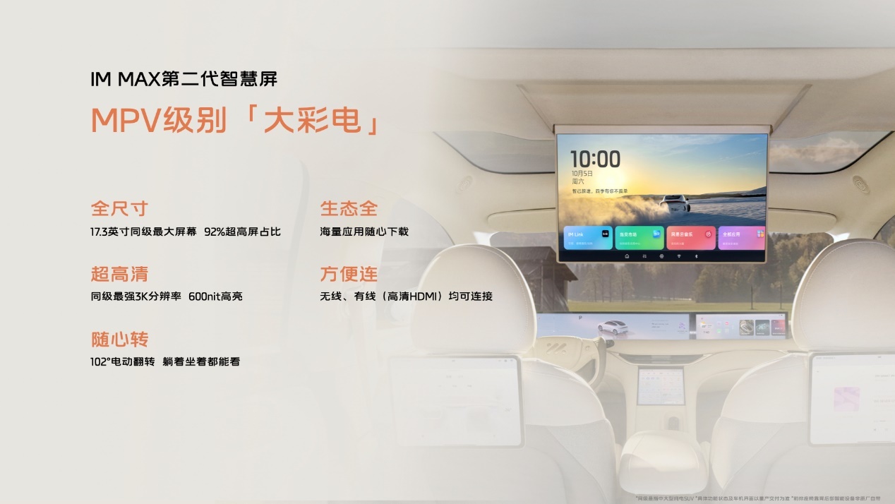 “MPV级大彩电”IM MAX第二代智慧屏的全系标配,是此次升级的一大亮点。该智慧屏与LS6独有的“零重力、贵妃椅、大床房”三躺模式相得益彰,让用户无论是坐着还是躺着,都能享受绝佳的观影体验,实现“移动头等舱”的娱乐自由。同级最大的17.3英寸3K高清屏幕,结合全车21个扬声器打造的WANOS 7.1.4全景声场,为用户带来身临其境的剧院级视听盛宴。不仅如此,这一全能座舱还是带娃神器,能化身浪漫私享影院,露营时可切换为K歌房或游戏空间,甚至在紧急会议时还能投屏办公,满足每一位家庭成员的多样需求。