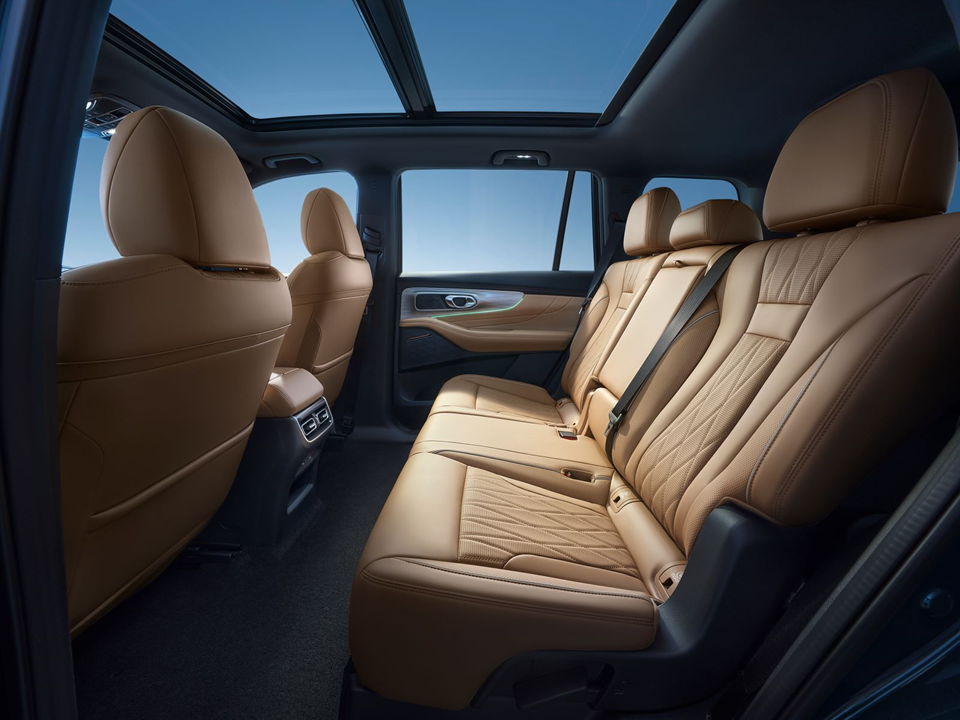 空间是很多选择SUV车型的用户关注的核心诉求,宜商宜家才是王道。在尺寸方面,传祺GS8车身尺寸达到4980×1950×1780mm,轴距长达2920mm,原本就是一辆大七座SUV。在大五座布局下,传祺GS8二排空间和后备箱空间得到质的提升。第二排腿部空间超过两拳,头部空间也极为宽裕。后备厢容积高达892L,放倒后可扩展至2100L,轻松放下20+标准行李箱,无论是家庭年货还是露营装备,都能轻松容纳。而且座椅还支持多角度调节,后排靠背倾斜角度可达131°,长途乘坐更加舒适。