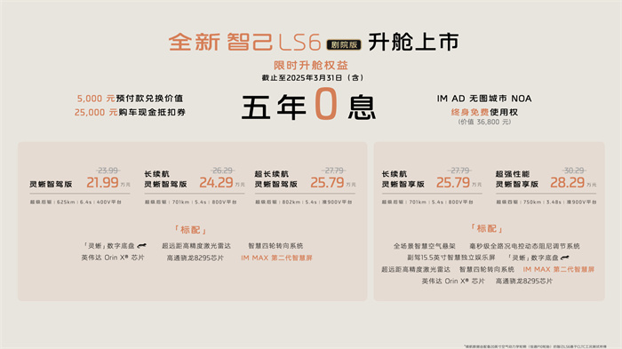满配再升舱,已是同级最强智能SUV。发布会上,智己汽车诚意加码,还公布了极具吸引力的用户权益。3月31日前锁单,可享5,000元预付款兑换价值25,000元购车现金抵扣券,即直享21.99万~28.29万元限时权益价;及价值36,800元的IM AD无图城市NOA终身免费使用;同时,还有“5年0息大额贷”金融方案,购车零压力。