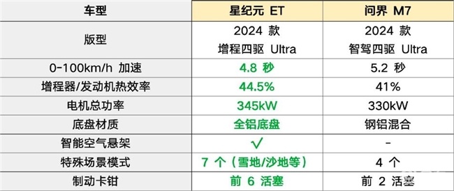 在动力方面,星纪元ET与问界M7都选择增程形式,兼顾纯电动的低出行成本和便捷性,满足用户需求,又不用改变驾驶习惯,也是理想选择。星纪元ET搭载了专为全域800V平台设计的前后双电机电驱动系统,最大功率达到345kW,0-100km/h加速时间仅为4.8秒,展现出卓越的动力性能。其雪豹四驱系统具备同级加速最强、安全脱困能力最强以及驾驶场景模式最多三大优势,能够轻松应对各种复杂路况。相比之下,问界M7的四驱系统虽然也采用了电动四驱技术,但在动力分配和响应速度上稍显不足,0-100km/h加速时间为5.2秒。星纪元ET的增程系统不仅动力强劲,还具备高效的能量利用效率,其馈电油耗低至5.9L/100km,远低于问界M7的7.4L/100km,为用户节省了出行成本。