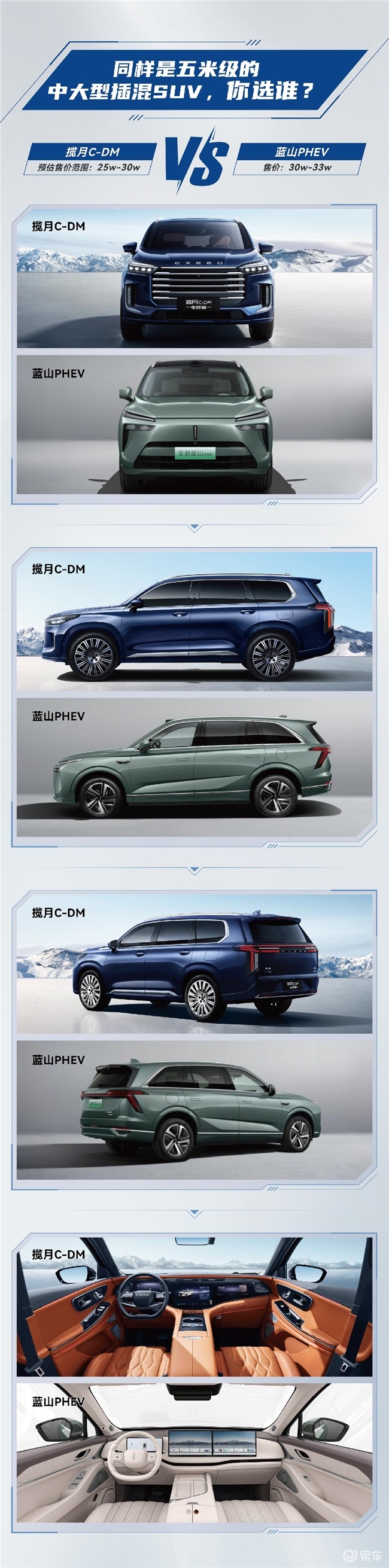 但是随着揽月C-DM量产车批量下线,并即将开启预售,很多车友突然发现,燃油车时代的星途揽月和魏牌蓝山确实没有关系,但是当星途揽月有了C-DM车型,正式进入混动时代之后,星途揽月C-DM和魏牌蓝山之间,显然就有了很多可以对标的理由。所以,上面的长图就是好事者们,就两个车型做的一个对标海报。从海报对比上,我们突然能直观的发现,原来星途揽月C-DM和魏牌蓝山之间,竟然有那么多相同的点。