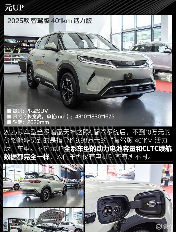 比亚迪元UP作为该价位段的代表车型,2025款全系新增天神之眼C智驾系统。其中9.98万元的智驾版401KM活力版搭载70kW前置永磁同步电机,0-100km/h加速12.9秒,配备45.12度磷酸铁锂电池,CLTC续航401公里。实测显示,183cm的体验者在前后排均能获得充足头部空间,后排腿部空间达两拳,整车质保为6年或15万公里。