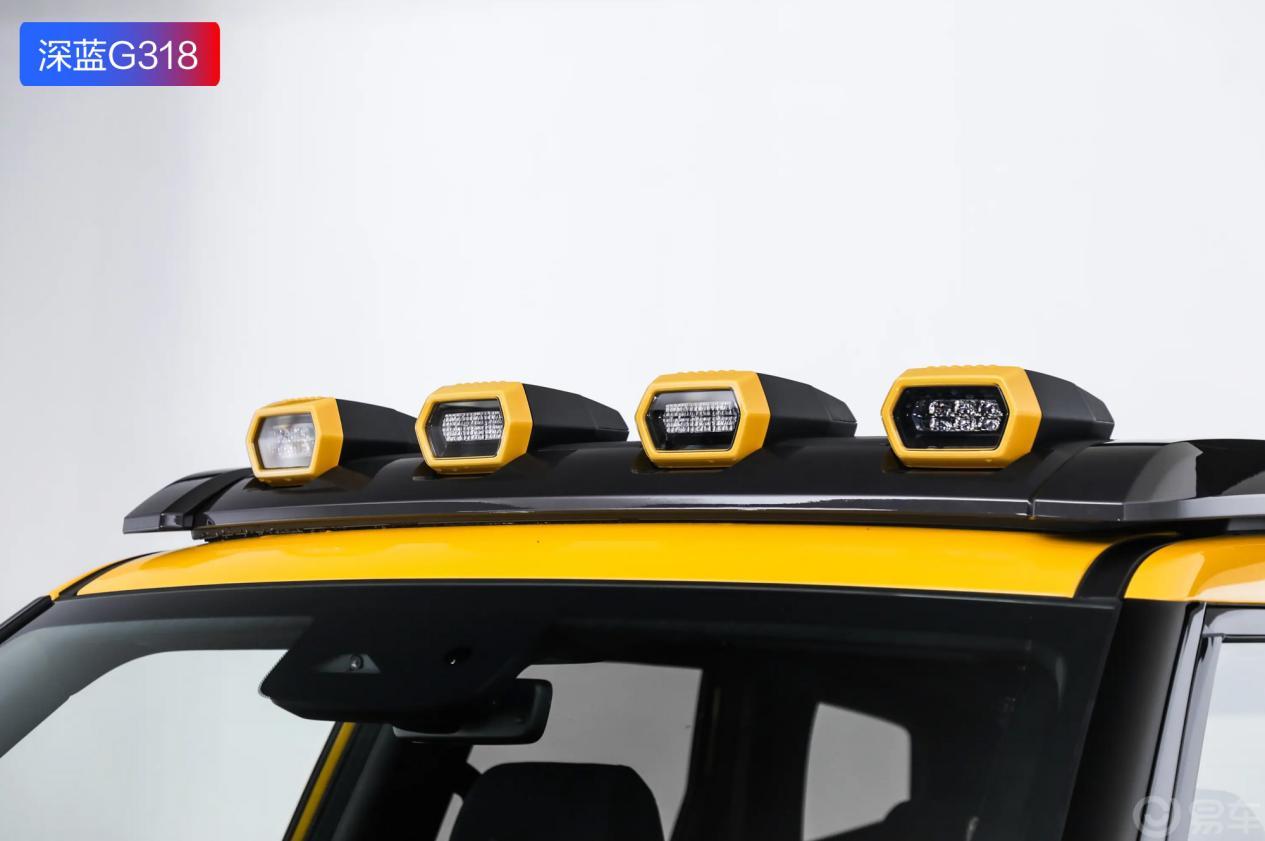 灯光方面是深蓝 G318 无忧穿越版的一大特点,除了C型全LED前大灯、徽标灯以及前格栅黄色警示灯之外,车顶还安排有行李架远光组,4个灯组里有2个远光辅助灯加2个露营灯,不仅看着越野味道更浓,照明能力也是比一般车更强。