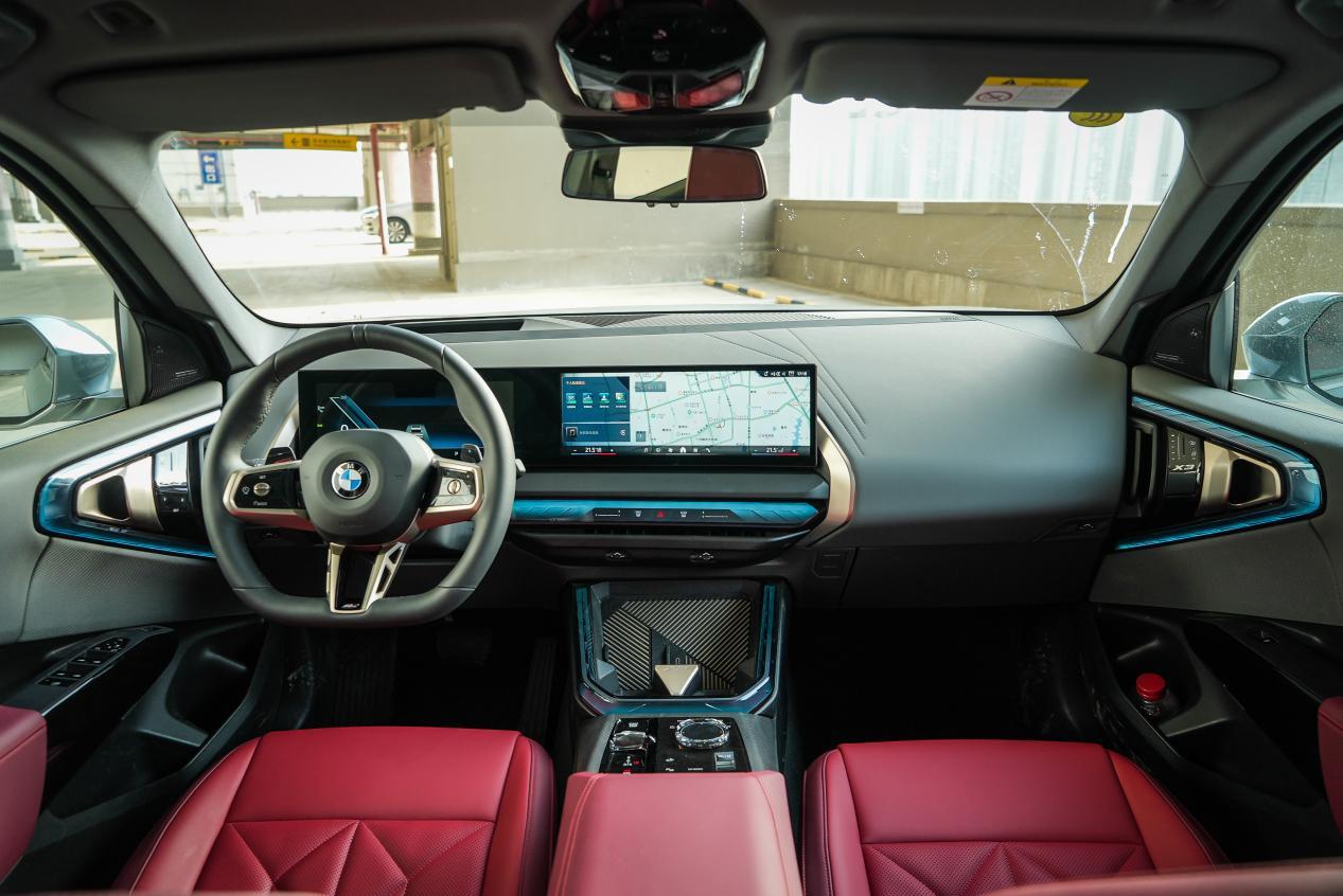 宝马X3L的内饰是完全不同的风格,大屏幕和氛围灯突出的就是科技感。但X3L的内饰有点硬,不光是材料硬,设计风格也硬。方方正正的大屏幕直接塞在中控台上,门把手和空调出风口放在一起,组成了一个大三角形。整体设计还挺有想法的,但是太直接了,典型的工程师思维产物。