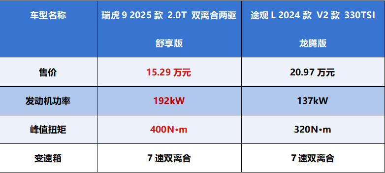两款车型都采用了2.0T发动机+7DCT变速箱的组合,账面参数都不差。但2025款瑞虎9显然调校更为“激进”,最大功率192kW,峰值扭矩400N·m,性能领先于途观L(最大功率137kW,峰值扭矩320N·m),起步更快、超车更爽,面对满载或山路等复杂场景时,也更游刃有余。