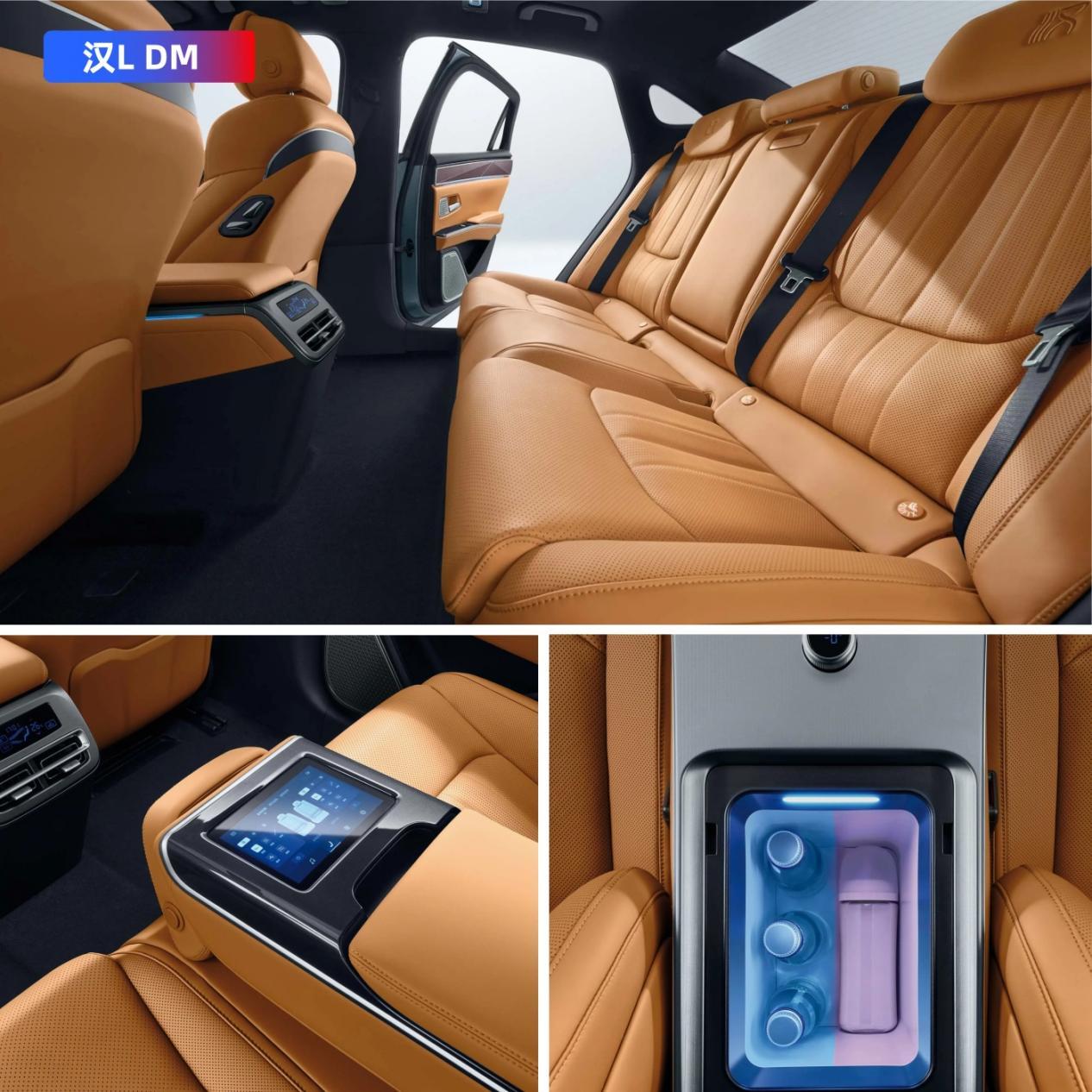 在舒适性配置上,汉L前后座椅均具备通风加热、14向电动调节、SPA级10点按摩,后排配置中央扶手屏和后排空调控制面板,标配老板键。同时,得益于汉L的5050mm的车长和1960mm的车宽,后排空间乘坐三人依旧宽敞从容,前后排乘坐皆可享旗舰级豪华。另外,汉L上还搭载了7L宽温域智能车载冰箱,与空调共用压缩机,体积更小、制冷更快,且零噪音、零废热,支持制冷、保温、加热,无论是热奶还是冰饮,通通不在话下。