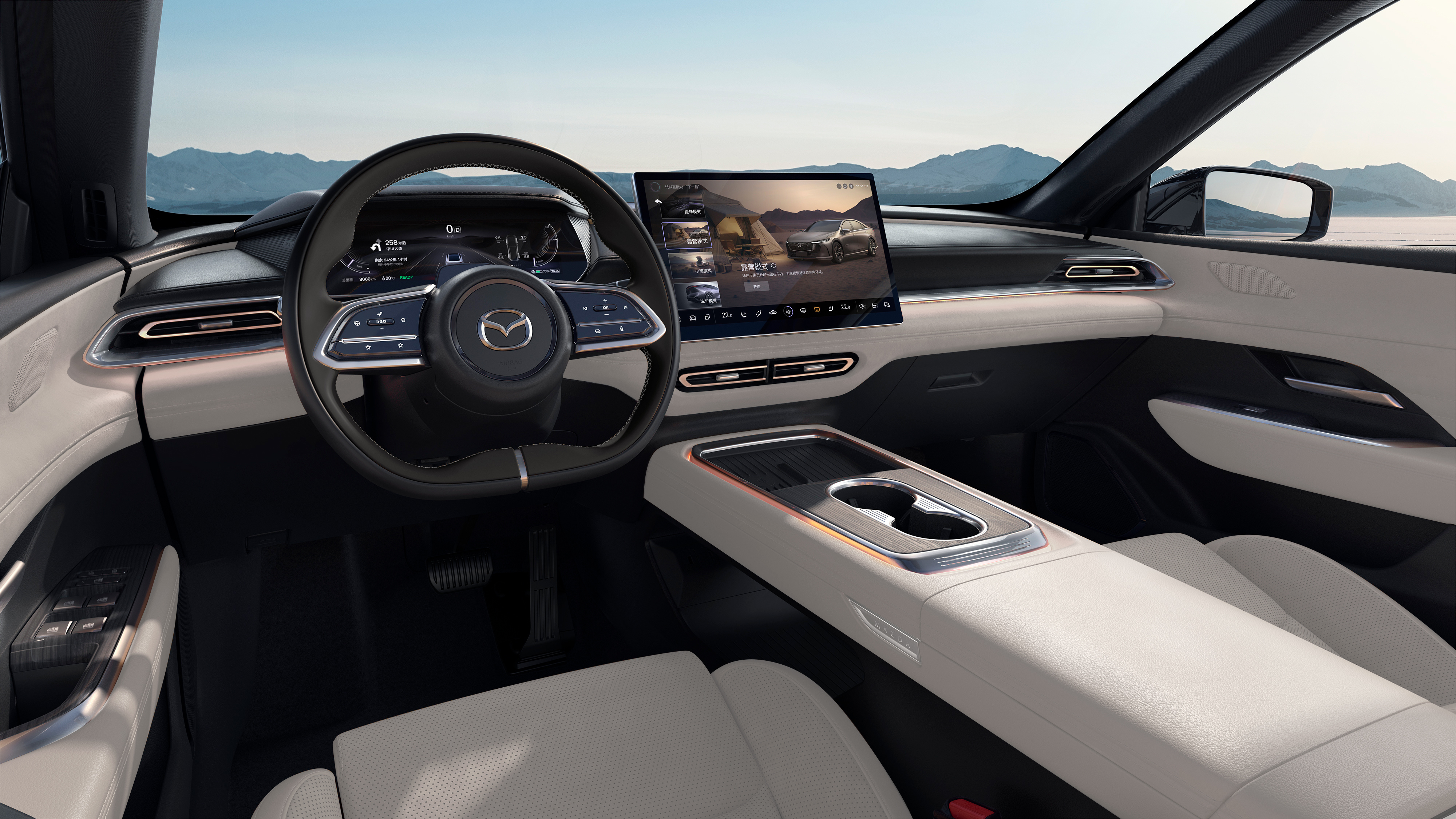 这是MAZDA EZ-6刚推出的浅色内饰,跟之前的赤麂棕色高配内饰颜色相比,营造出截然不同的两种氛围,这种感觉,是不是跟换了一辆车一样。坐到里面,本来富有激情很运动的车,一下子感觉就变得更恬淡舒适。甚至,你会觉得浅色内饰的空间都会感觉大一点。