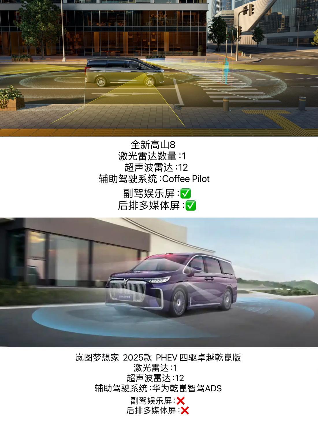 高山8以3万元价差精准狙击家庭用户痛点。其Coffee Pilot Ultra智驾系统依托27个高精传感器与无图化技术,支持200+车位类型识别、3公里记忆泊车与100米循迹倒车,在重庆8D立交等极端场景中实现自主泊车,甚至能OTA升级“车位到车位”功能。岚图梦想家虽搭载华为乾崑ADS 3.0系统,但实测显示其无图化能力尚未完全开放,复杂停车场决策效率略逊一筹,依赖高精地图的特性限制了场景泛化能力。