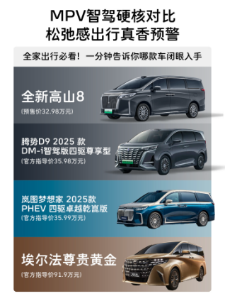 家人们,五一全家出游选MPV,既要装得下三代同堂的欢声笑语,又要让驾驶位的老司机轻松躺赢!今天咱们就横向对比 全新高山8、腾势D9 2025款、岚图梦想家2025款和 埃尔法尊贵黄金 四款MPV车型,从钱包友好度到黑科技配置,手把手教你挑对车!