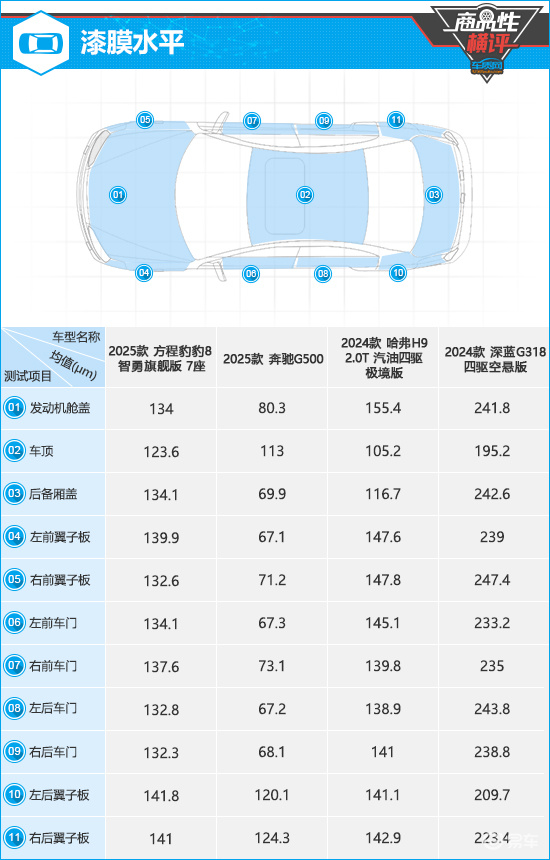 通过以上各项对比不难发现,本次选取的四款硬派造型中大型SUV在商品性方面均交出了令人满意的答卷。作为豪华品牌车型,奔驰G500在制动踏板宽度、座椅座垫长度以及后备厢开口面积等方面表现突出,展现出过人的人机工程学设计水准。深蓝G318在外部做工、噪音和振动抑制等方面均有着不错的表现。哈弗H9拥有较强的后雷达探测能力,提升日常用车的安全性和便利性。而方程豹豹8在多项测试中表现亮眼,综合产品力出众。总体而言,四款车在商品性方面都能满足日常使用需求,消费者可放心选购。