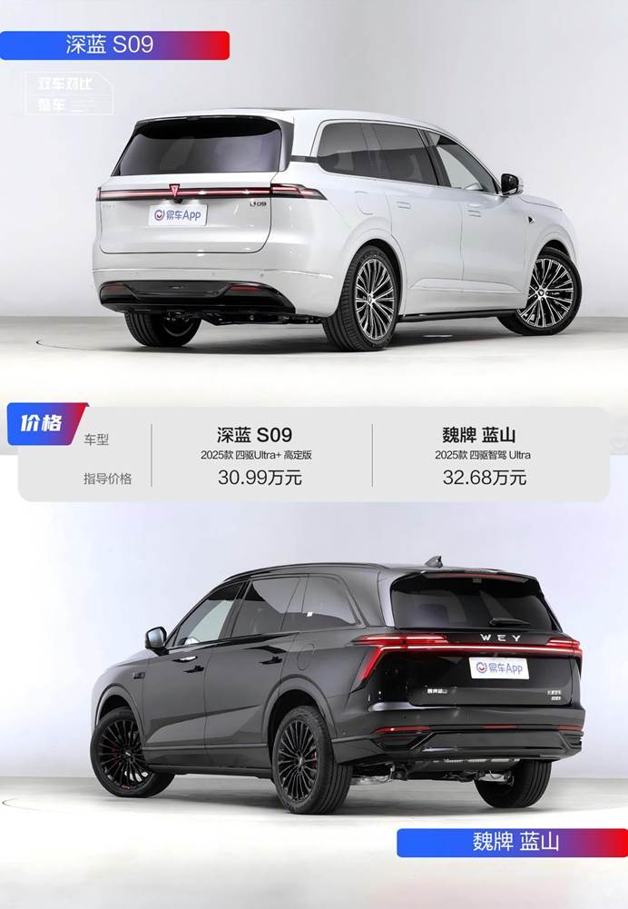 我们根据价格相近原则,选择最能代表两款车综合实力的顶配车型,分别是深蓝S09 2025款 四驱Ultra+ 高定版,指导价30.99万元;和魏牌蓝山2025款 四驱智驾 Ultra,指导价32.68万元。