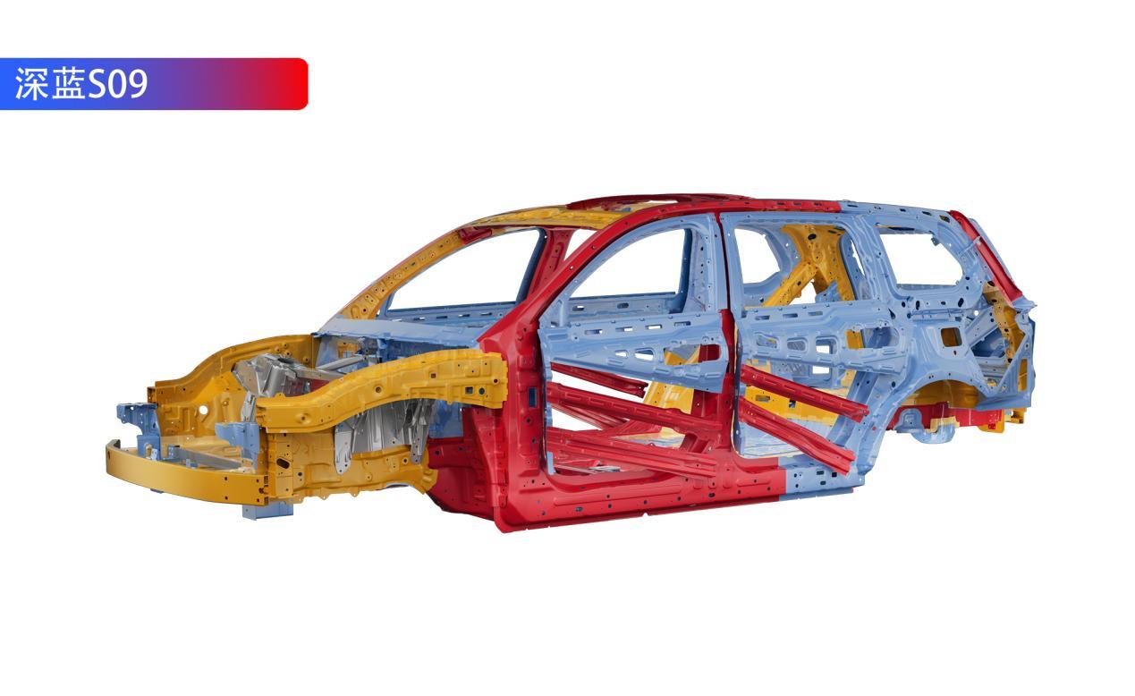 全家自驾出行,空间是第一要求,深蓝S09采用了潜艇级笼式车身,上车身5横4纵,下车体13横5纵,车身材料也采用了81%高强钢和铝合金占比,材料强度最高达2000MPa,乘员舱100%高强钢,通过了全球最严安全碰撞标准,车身安全相当硬核。