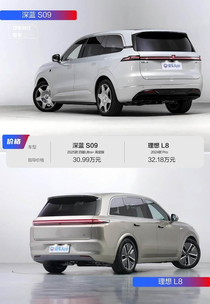 根据价格相近原则我们选取的车型分别为是:深蓝S09 四驱 Ultra+高定版,指导价30.99万元;理想L8 2024款 Pro版,指导价32.18万元。