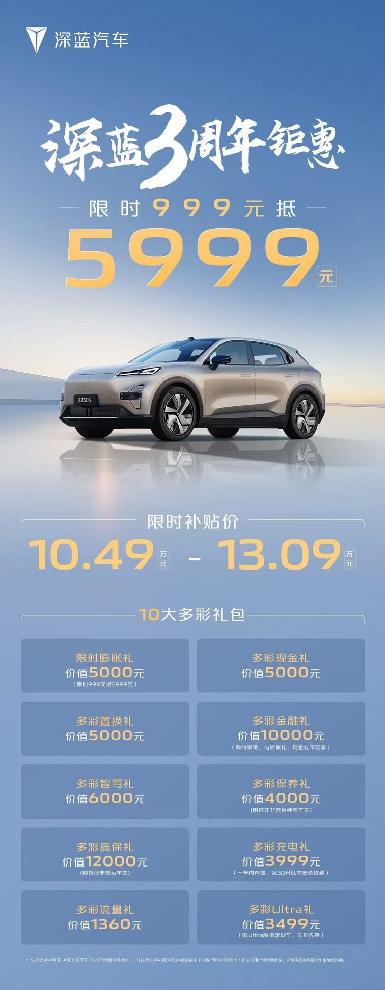 好消息传来,深蓝S05在5月推出了一系列购车福利。限时补贴价仅为10.49-13.09万元,同时还有10大多彩礼包等你来拿。其中包括限时999元抵5999元的膨胀礼(请注意,此礼与现金礼不同享)、限时现金优惠5000元、深蓝置换补贴高达5000元。更有价值10000元的多彩金融礼、6000元的多彩智驾礼、4000元的多彩保养礼、12000元的多彩质保礼、3999元的多彩充电礼、1360元的多彩流量礼以及3499元的多彩Ultra礼等您来开启。如此丰厚的福利,真是既超值又厚道!