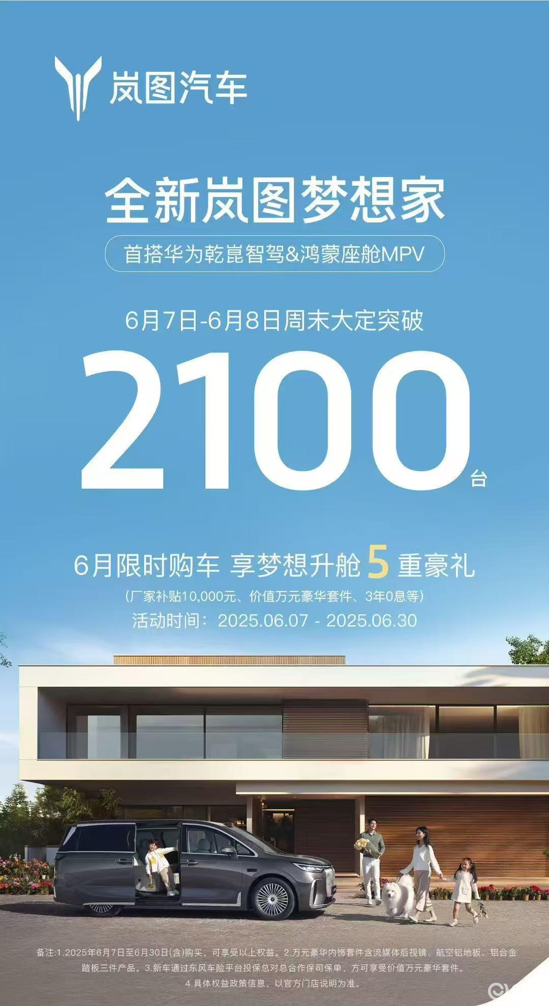 (原标题:岚图梦想家上周末官促两日大定2100台,腾势D9暂未跟进)