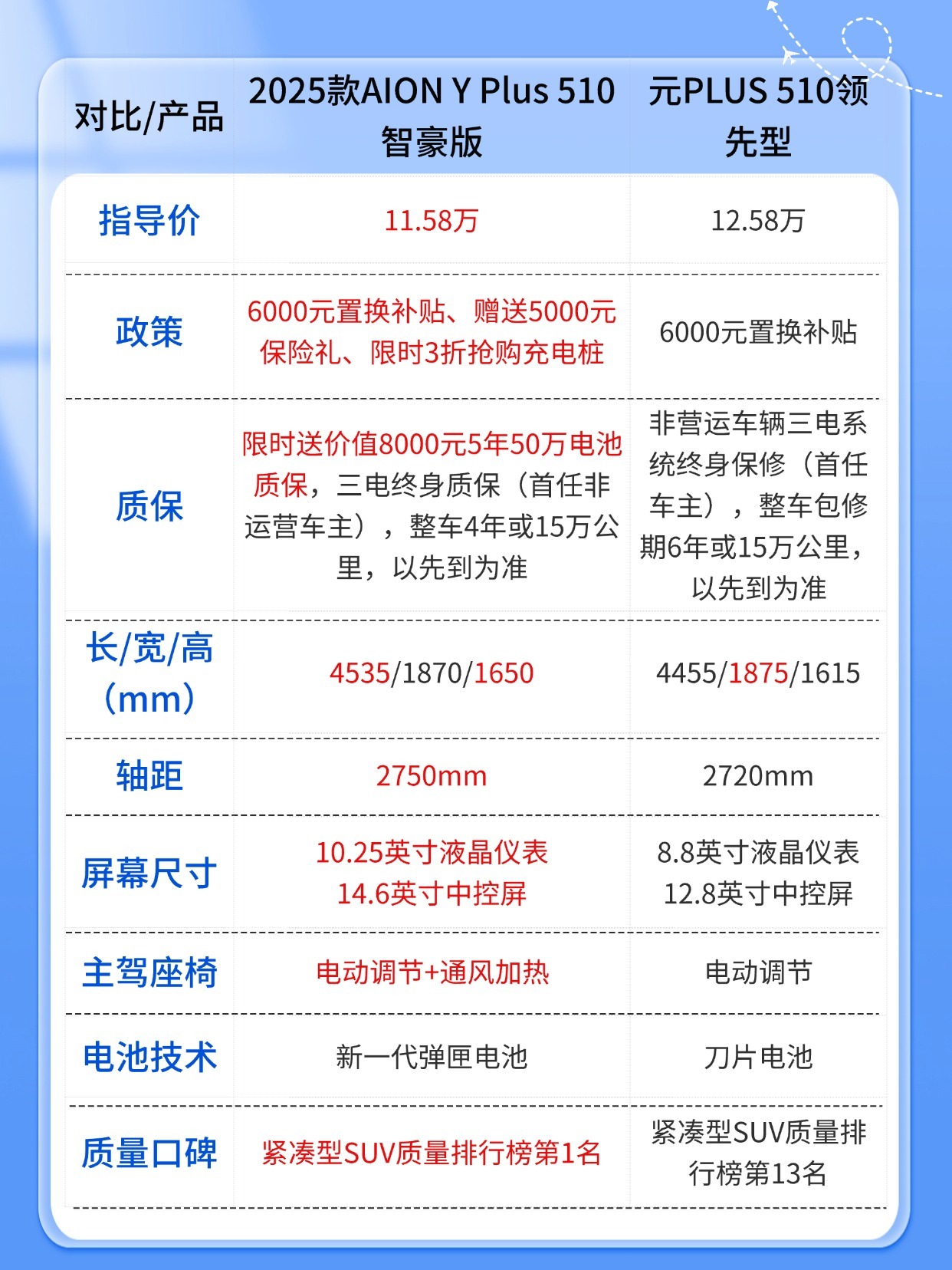 答案是便宜了1万元的2025款AION Y Plus 510智豪版,我们做了个简单的对比表格,可以直观呈现下两者的差别。