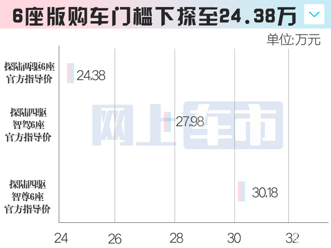 据经销商透露,两驱6座版官方指导价为24.38万元,相比在售的四驱智驾版6座,便宜了3.6万元;相比四驱智尊6座,便宜了5.8万元。另外还享受3000元订金膨胀至高抵27,000元的优惠政策。