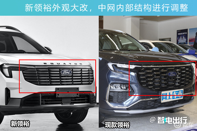 新款领裕采用全新的前格栅造型,内部为矩形点阵式设计。新车前格栅颜色、福特品牌标识颜色以及贯穿式装饰条颜色都可以进行选装。