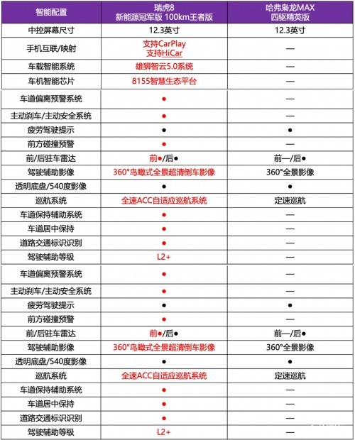 足球赛场上,好的中场既能轻松完成智慧、灵巧的盘带,又能精明洞察到对方技战术,拿出有效的进攻与防守策略。就像超级巨星拥有强大的控场能力一样,如果一台车想要拥有良好“全场意识”和“整体掌控力”,那么就需通过“脑力”与“视野”进行强化。瑞虎8新能源冠军版配备了雄狮智云5.0系统、8155智慧生态平台,带来“因为AI,所以‘语’众不同”的操控体验,让“懂社交”的智慧出行随时发生。同时,车道偏离预警系统、全速ACC自适应巡航系统、360°鸟瞰式全景超清倒车影像等配置应有尽有,覆盖用户出行全场景。总之,瑞虎8新能源冠军版从智能联想、分析判断,到位置感、预见性等,可谓“智多不压身”。反观哈弗枭龙MAX,科技配置数量略显吝啬,让科技控们倍感遗憾。