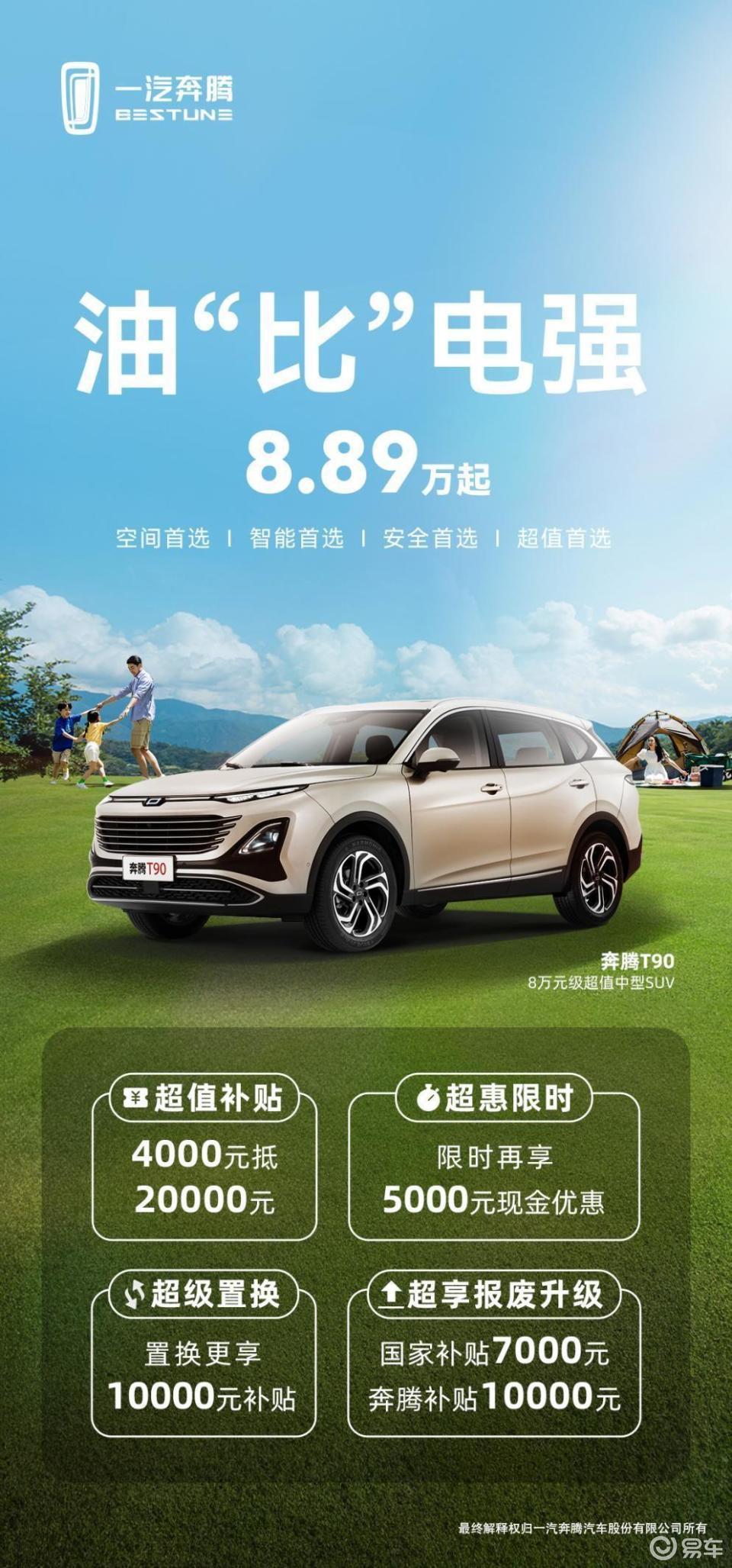 最后让我们再一次回到价格,虽然奔腾T90官方指导价在10万元左右,但在油“比”电强的全面促销政策下,但现在仅需8.89万元即可入手,更吸引人的是,厂家提供了4000元抵20000元的优惠补贴,为预算有限的消费者提供了额外的优惠。此外,官方还限时推出了5000元的现金折扣,进一步降低了购车门槛,抄底一辆好车,就趁现在!