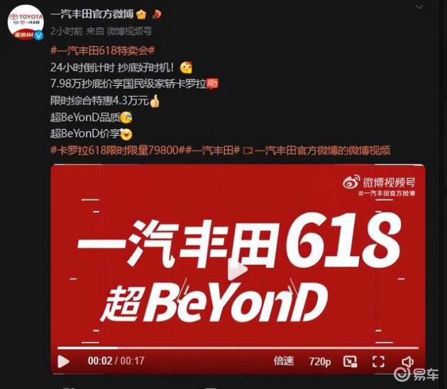 据证券时报,6月18日,一汽丰田官方微博发布消息,即日举行24小时限时特卖会。其中,紧凑型SUV卡罗拉锐放售价9.98万元起,限时综合优惠3万元;紧凑型轿车卡罗拉售价7.98万元起,限时综合优惠4.3万元。