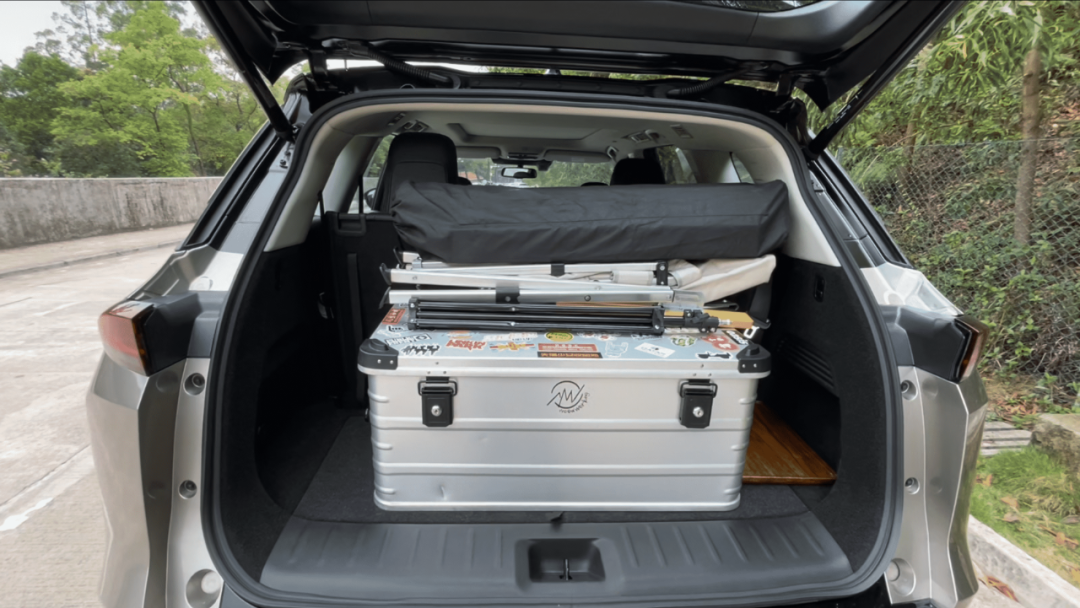 另外,探陆的车长超过了5m1,当三排座在都打开的情况下,后备箱的空间也足够装载全车人露营的装备或者是全车人过夜的轻便行李,我们是为了拍摄好看才用的硬质铝箱,如果换成软包的话,全车人的行李都不成问题。不过要搬放大件行李的话,那就得放倒二、三排,这时的探陆妥妥地拥有小货车的装载能力。