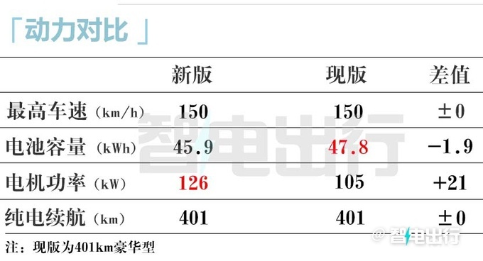 新车继续搭载永磁同步电机,匹配江苏时代磷酸铁锂电池,电池组质量378kg,最高车速150km/h,与现款一致,直流快充时间(30%-80%)为30min。