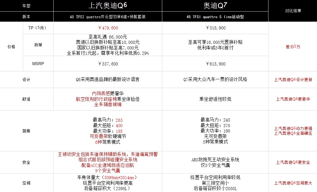 当然,对比进口的Q7来说,Q6只有42%的核心件事进口件,其余件是国产化。至于优劣就看你个人感知了。因为从数据来说,你获得了更好的配置、动力、空间以及性价比。但是有人也会介意他不是进口车型。