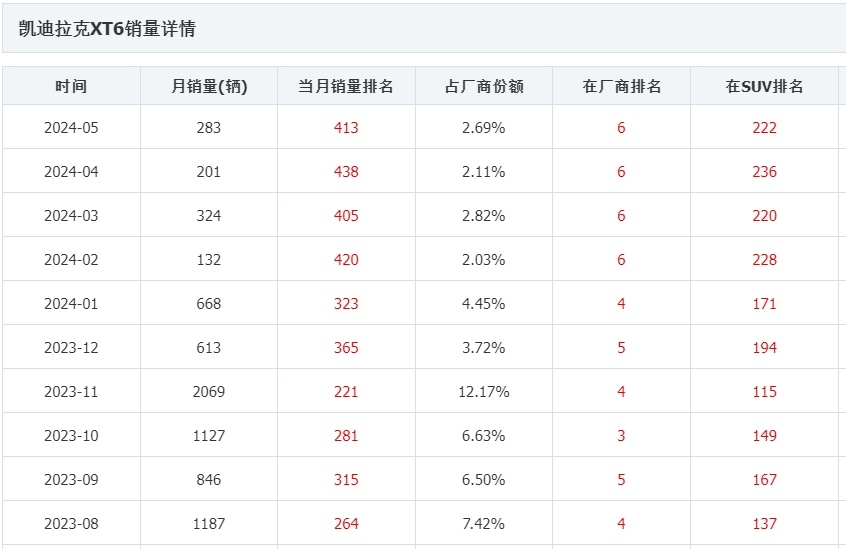 作为中大型SUV的一员,凯迪拉克XT6同时提供6座和7座供选择,但受市场上新能源SUV的影响,销量持续下滑,去年12月份开始,凯迪拉克XT6的月销量就只有3位数了,5月份也才卖了283辆,位列中大型SUV销量排行榜的第38位,表现一般,也确实需要改款了。