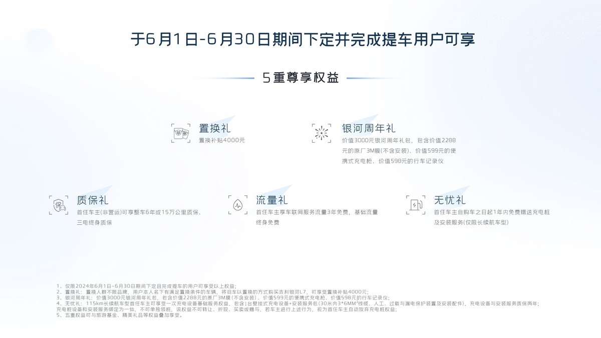 准车主们还可以享受五重尊享权益,其中,高达4000元的置换补贴,让换购升级之路更加顺畅;三年免费基础流量服务与三电系统终身质保政策,以及首任车主还将享有价值3000元的银河周年礼包,内含高品质的原厂3M车膜、便携式充电枪和行车记录仪,全方位提升出行体验。针对115km长续航版本,更有充电桩设备基础服务权益,从安装到使用,全程无忧。